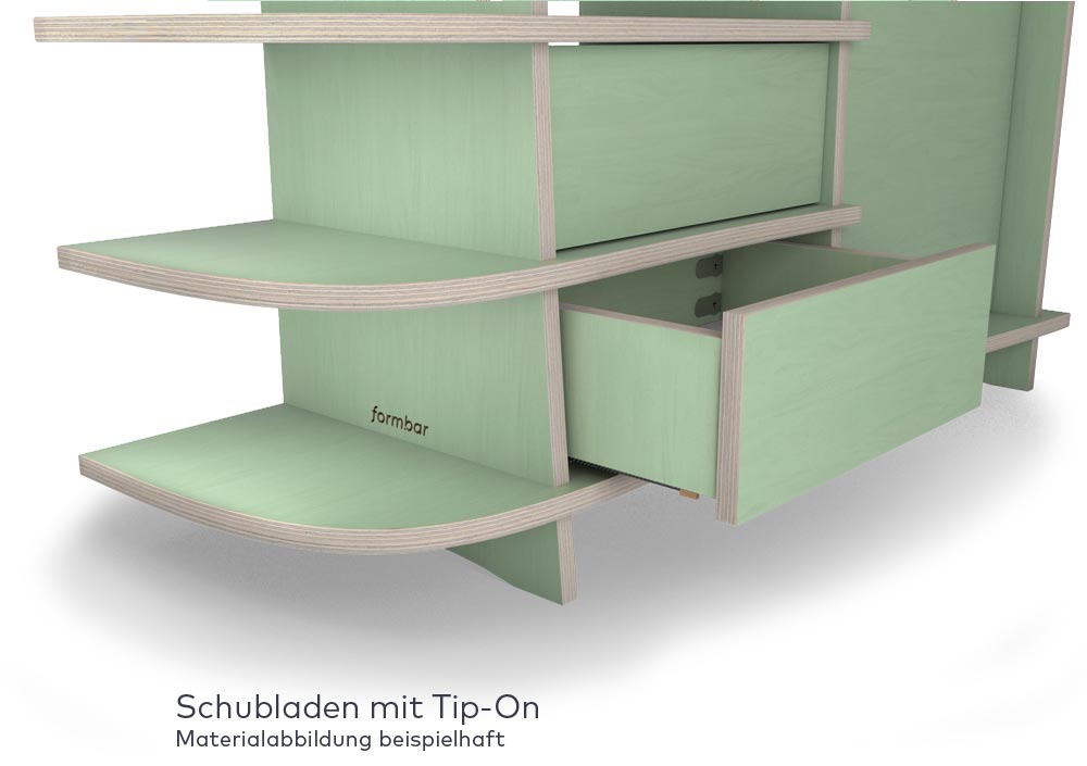 Wähle aus vier Fronten-Typen aus, um geschlossene Fächer zu konfigurieren. Unsere Türen, Klappen und Schubladen sind allesamt mit Tip-On- bzw. Push-to-Open-Beschlägen versehen, sodass ein leichter Fingerdruck reicht, um die Fronten zu öffnen - ganz ohne Griff oder Handeinlass. Die Sekretärklappe stellt dabei einen besonderen Fronten-Typ dar, denn ihre Funktion beschränkt sich nicht auf das Schließen eines Fachs, sondern dient als aufklappbare Schreibtischplatte oder auch Bar.